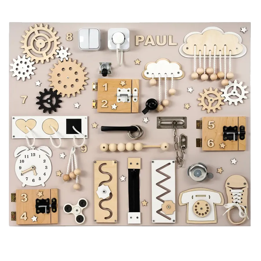 Le tableau d'activités, conçu pour stimuler la créativité et les compétences manuelles, est le moyen idéal de combiner apprentissage et jeu. Fabriqué en bois naturel et équipé d'éléments variés tels que des engrenages, des interrupteurs, des verrous et des lacets, il soutient le développement de l’enfant sur plusieurs niveaux.