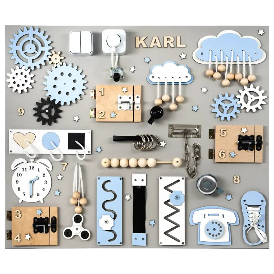 - Stimulation du développement : Le tableau propose divers éléments, tels que des cadenas, des engrenages, des lacets et bien plus encore, qui développent les capacités manuelles, la réflexion logique et la coordination motrice.