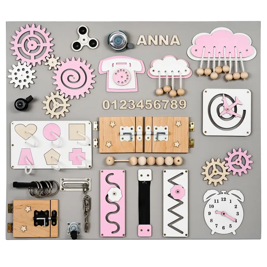 • Développement des compétences cognitives et manuelles : Les cadenas, bouliers, engrenages et formes à assembler améliorent la précision des mouvements et la réflexion logique.